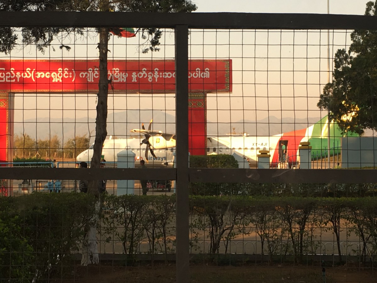 The road to Inle was closed so we took a propeller plane to Heho airport, only an hours flight. The airport was tiny, just a single building and they gave us a sticker as a boarding pass. My litre bottle of water was allowed through security if I promised to finish it before boarding the plane ๐