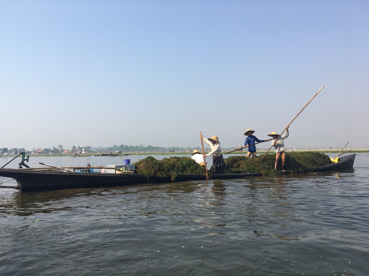 Surprisingly the water is crystal clear and below the surface are bright green plants (a bit like those mum fishes out of my pond at home!!) which local men harvest, transporting them to their village and turning them into floating gardens on which vegetables are grown. This looked like extremely hard work ๐ค