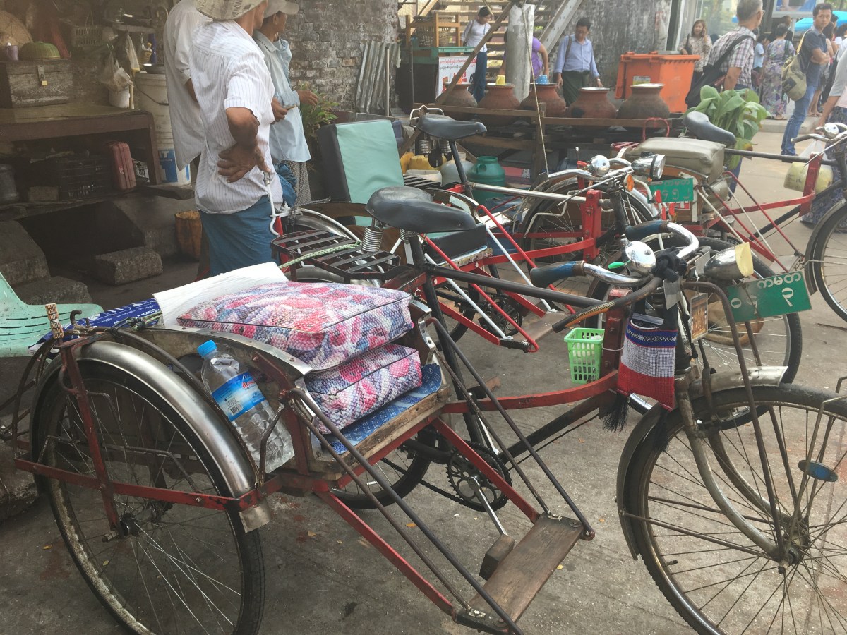 A particularly fun way to get around in Yangon is by tricycle, where you sit side car style on a bicycle. They go pretty fast, especially into oncoming traffic 😂 – see video!