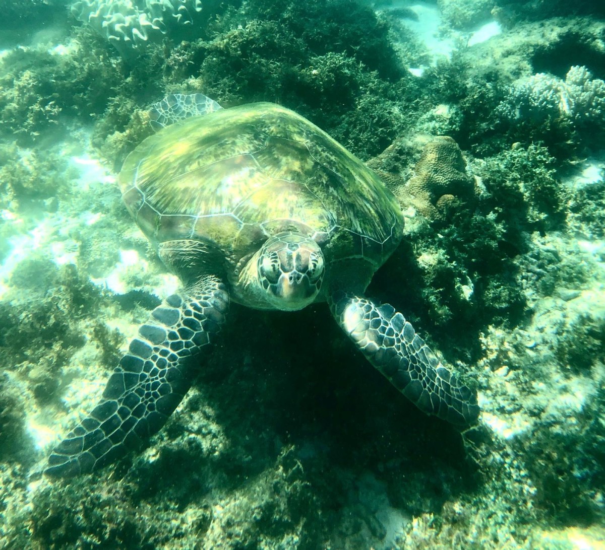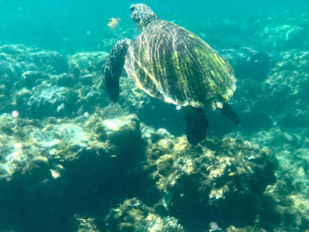 After an hours cruise we transferred to speed boats to reach the shore where we got two guides for our group of four. There were 65 people in total and I thought it was going to be chaos – but the ocean is big and the individual groups are small. Straight away we encounted giant turtles, wider than me and well over 1m in length. It was almost as good as the whale sharks, especially when you’re swimming along side these graceful creatures and they come up to the surface for air, sticking their cute little heads out next to you. Luckily Nathalia took some photos! The water was so clear I could see the divers below me.
