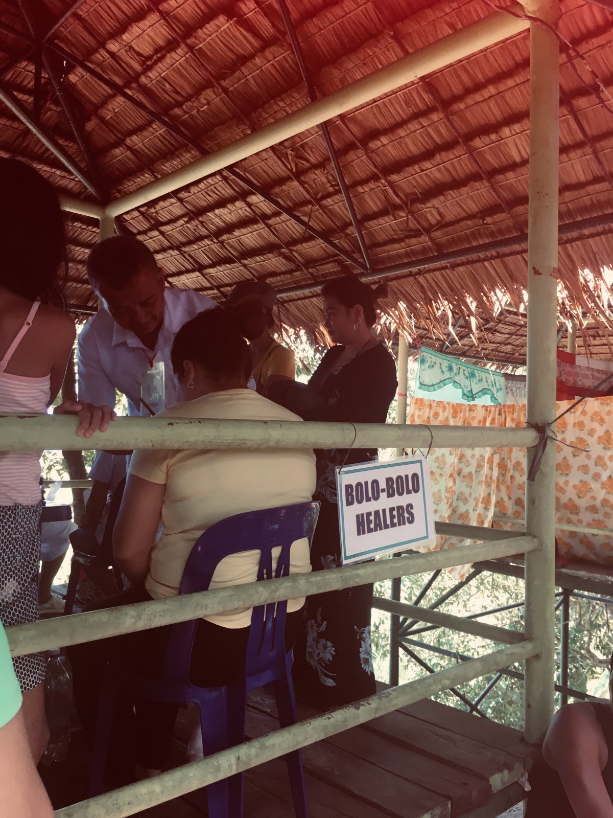 Next clue was a ‘band’ providing entertainment, cue bad singing and reading the words from an iPhone over a sound system which everyone seemed to love. After asking a few more times ‘WHERE ARE THE HEALERS??’ finally we found some little areas under the shade perched high up, with signs for various treatments and long queues of locals and a few tourists. Here we met Nathalia from Poland in the queue for the Bolo Bolo healing. We’d come this far so decided to stick it out and queue for all of them, not that we really knew what they entailed π