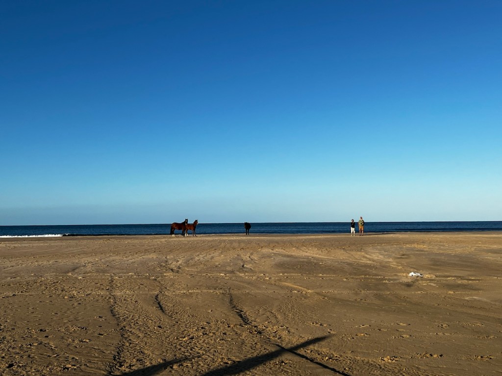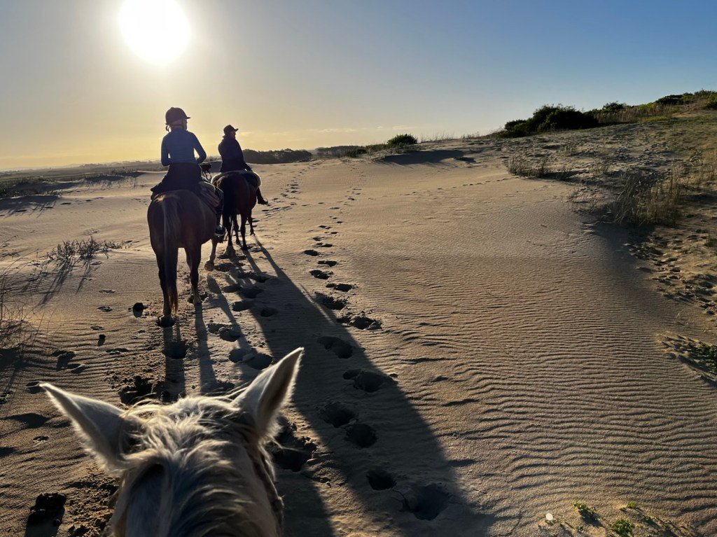 Riding through sand dunes, along the beach and through Wild West type desert landscape was incredible. As we led the horses through the steeper parts of the dunes we noticed they also try to step in existing footprints as it’s easier, just like we do. We passed a herd of cows on the beach but the best part was seeing the group of horses who had just popped down from the village to the beach on their own to enjoy the weather. They were just hanging out by the water until our dog Thea had a go and they galloped off into town – I’ve never heard actual thundering hooves before. Vix’s horse almost went with them.