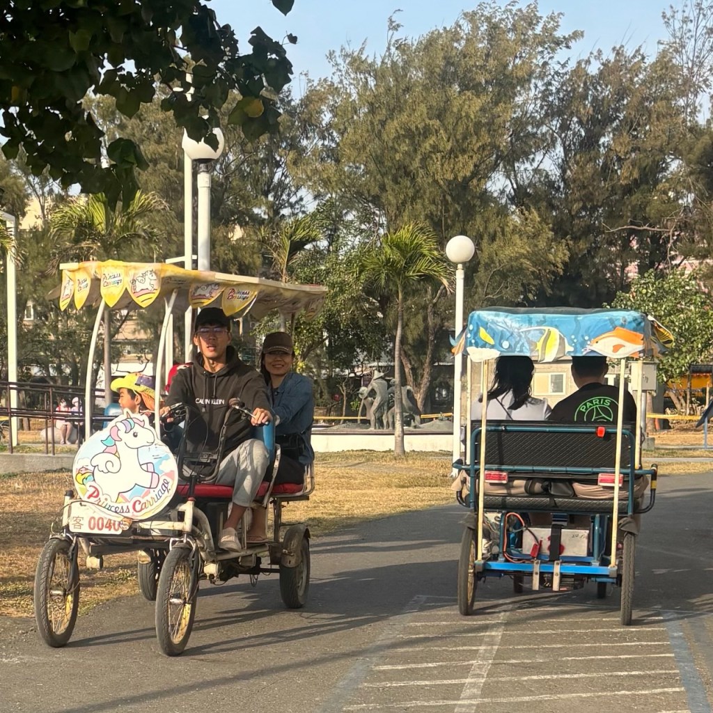 The palm tree lined black sand Cijin beach that stretches 1.5km is very pretty, too windy to swim but perfect for walking. You just have to dodgy the cutesy tricycles decked out like cartoon creatures that everyone rides like they’ve never ridden a bike before. Imagine strolling along enjoying the view then Mickey Mouse comes hurtling around the corner and there’s nowhere for you to go.