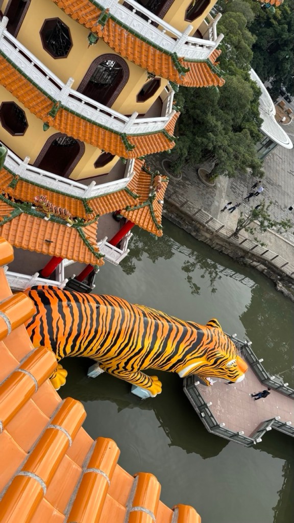 My favourite had to be the Dragon and Tiger Temples, which were designed to stand in the lake. These are no ordinary temples – I’m talking about temples where you enter through the mouths of huge dragon and tiger statues, climb up towers 7 stories high, and walk through tunnels connecting the temples to the shore, containing art that apparently tells stories (this went over my head). It’s mental and amazing.