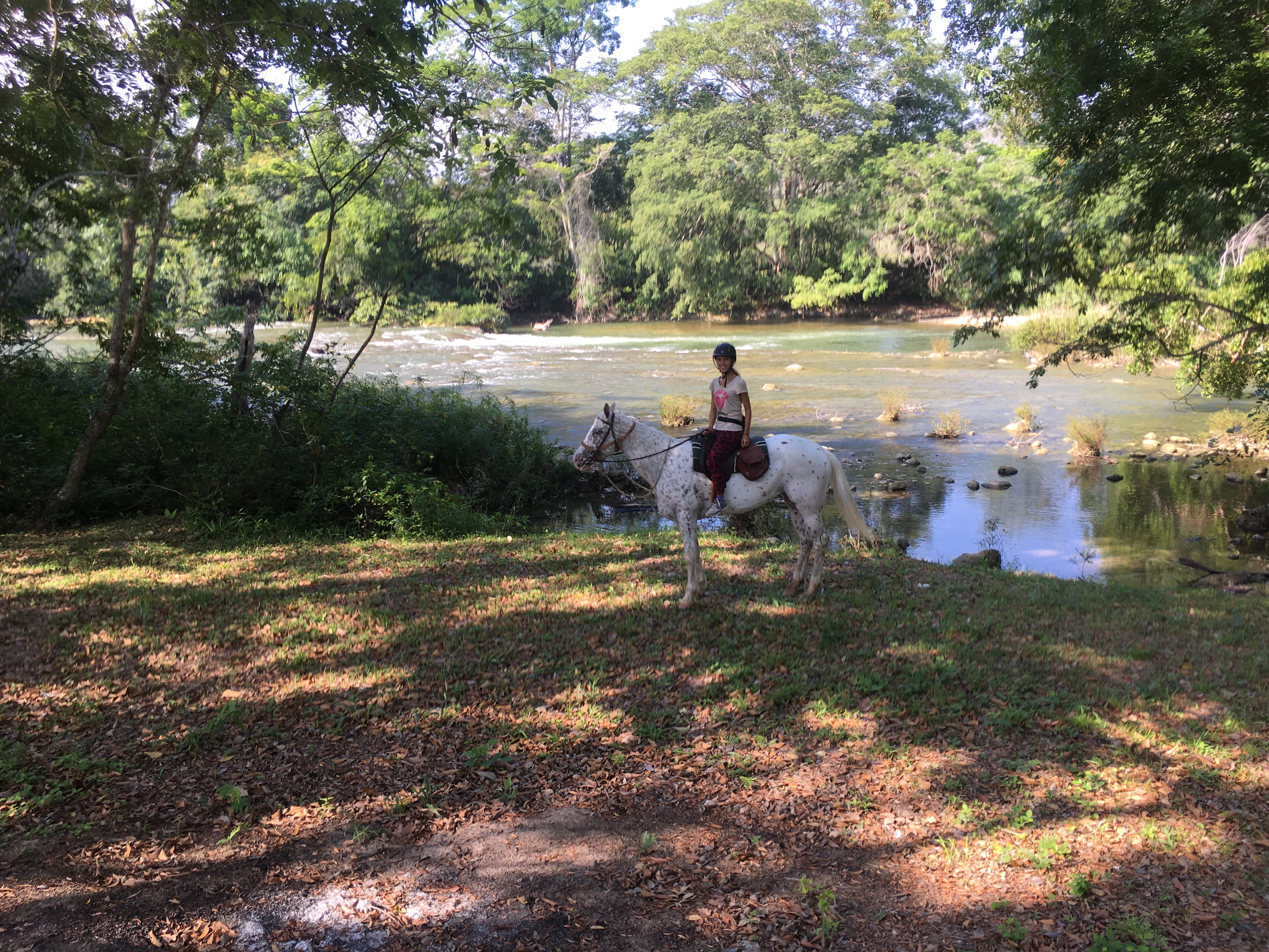 Ride along the riverWe rode on horseback to one of the main attractions in this area near San Ignacio, the Xunantunich ruins. Riding here was an experience like no other – these are huge, award winning horses. We rode alongside a turquoise river, though jungle and across a hand cranked ferry to reach the ruins site where the horses had a rest and I had a two hour tour of the site with a guide of Mayan heritage. An incredible experience – even more special because we were the only ones there!