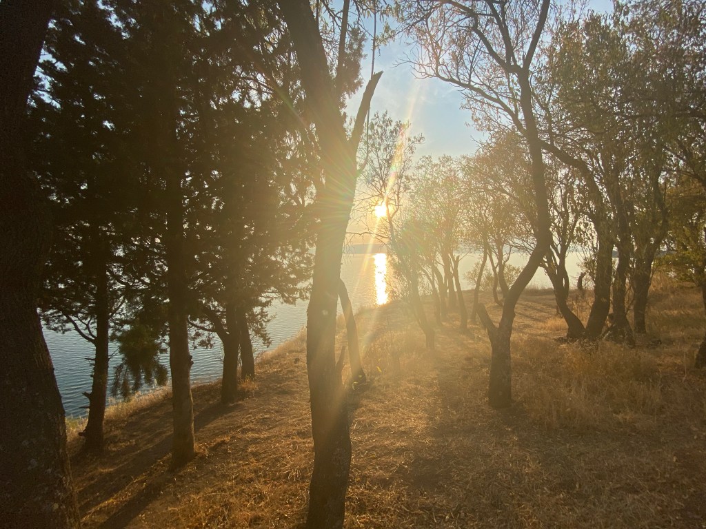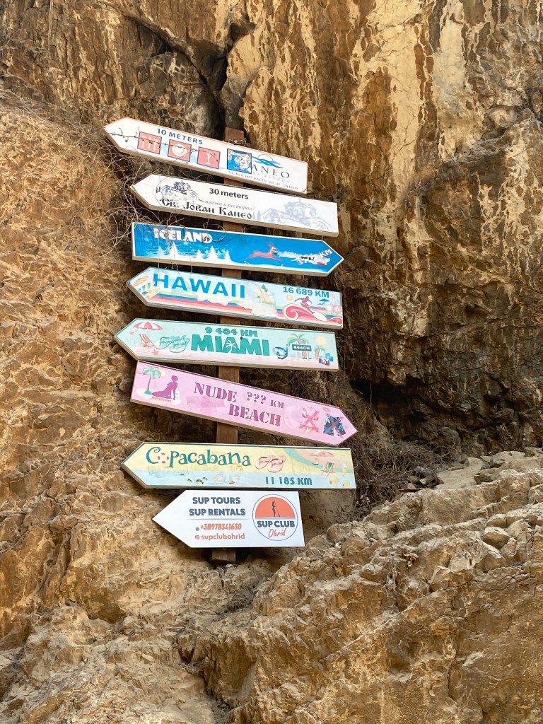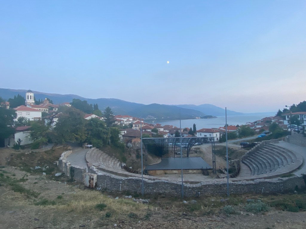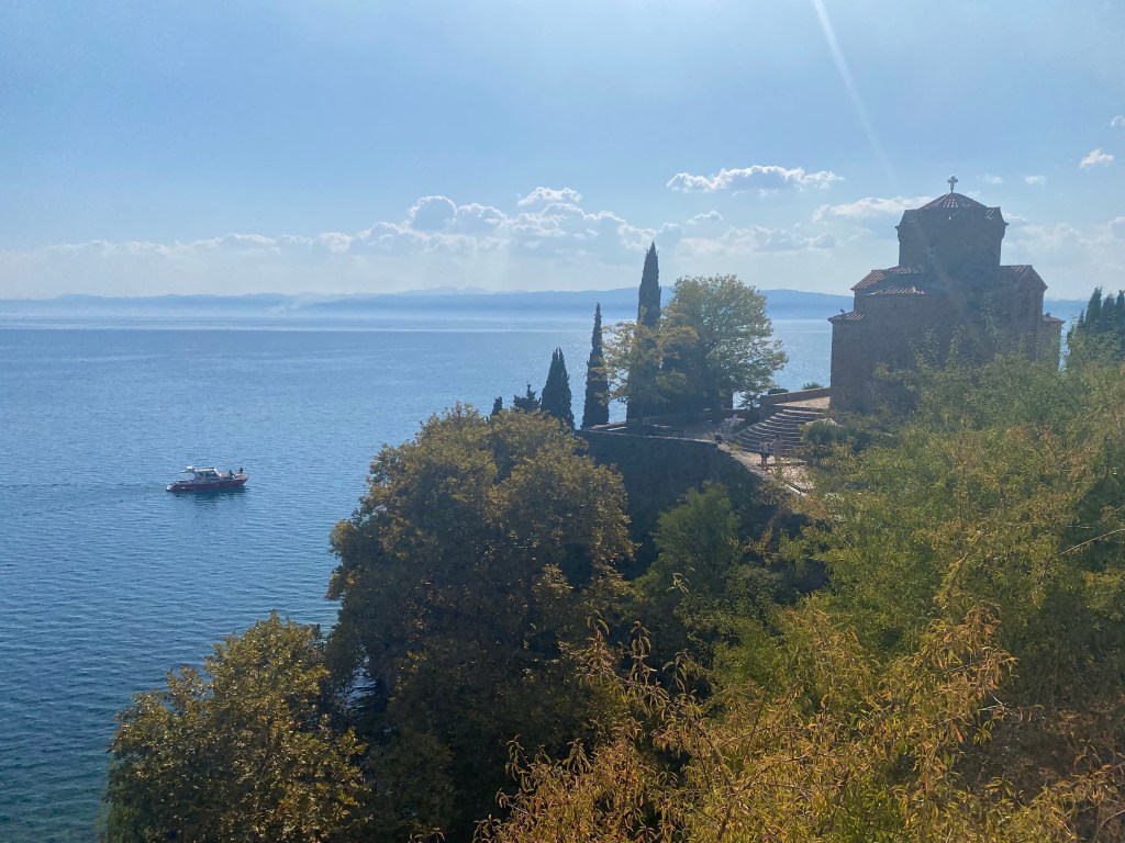 I checked out of my budget hotel early the next morning to bus it a few more hours south to the tranquility of Lake Ohrid, close to the border with Albania (Albanians make up a minority of around 25% in North Macedonia). The man at reception asked me ‘Did you see the statues?’ – I hadn’t -‘Go and look, they cost so much money someone has to see them!’. I put “statues” on my list of things see on my way back through Skopje.
